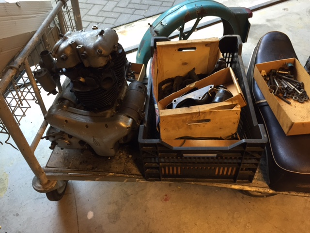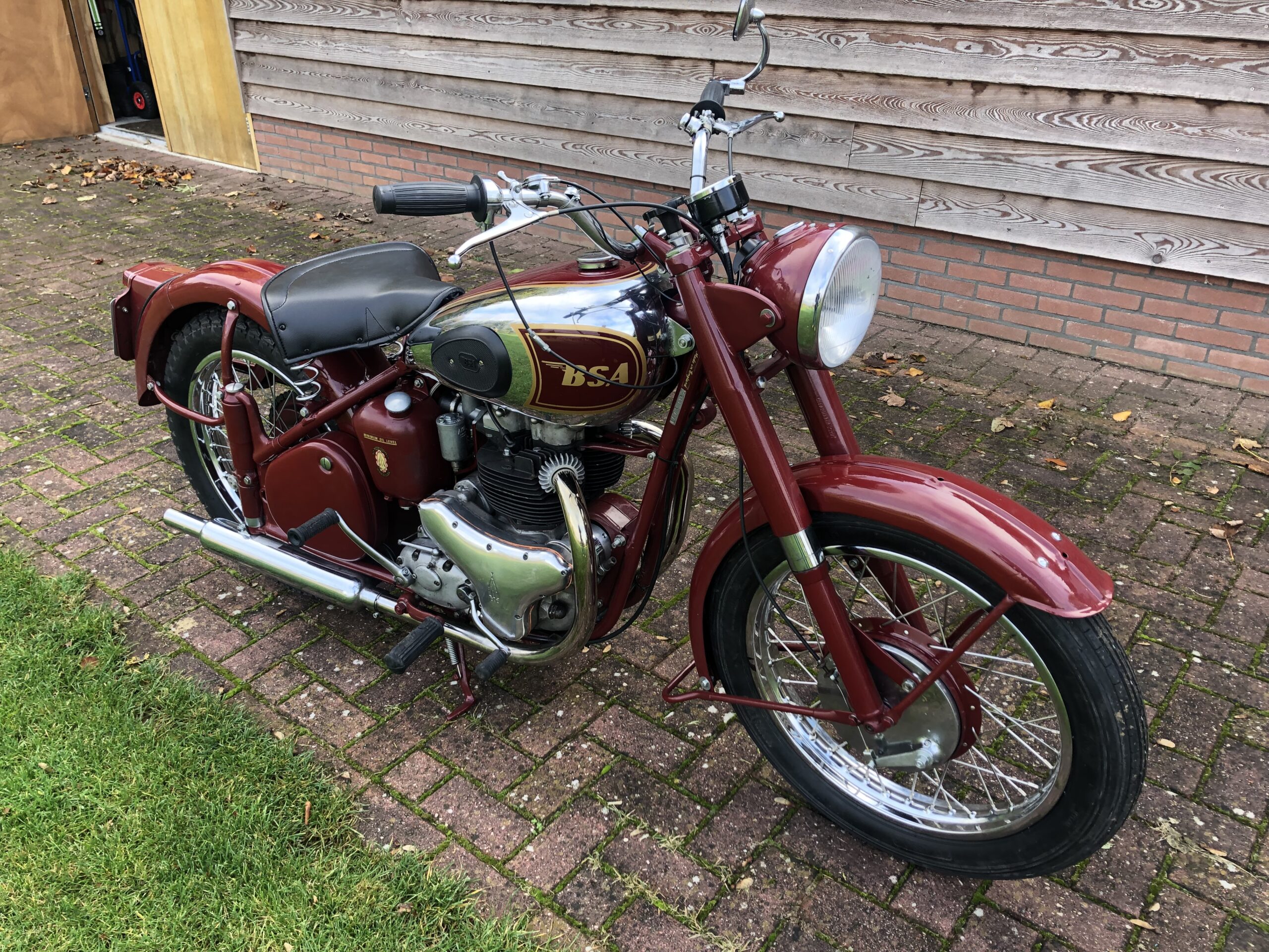 Deze BSA A7 uit 1955 vond ik in een garage in Roermond. De eigenaar zag geen gat meer in en wilde er graag vanaf.Wat de oorspronkelijke kleur was geweest, was nauwelijks te achterhalen, maar ergens suggereerde een plekje verf dat het wel eens Maroon kon zijn geweest. Daar dus maar mee verder gegaan, een goed tank gezocht, alle onderdelen in de juiste kleur laten spuiten of poedercoaten en dan gaan bouwen. Het blok had een complete revisie nodig, de sludgetrap zat helemaal dicht, etc. Uiteindelijk ben ik zelf erg tevreden over het resultaat.
